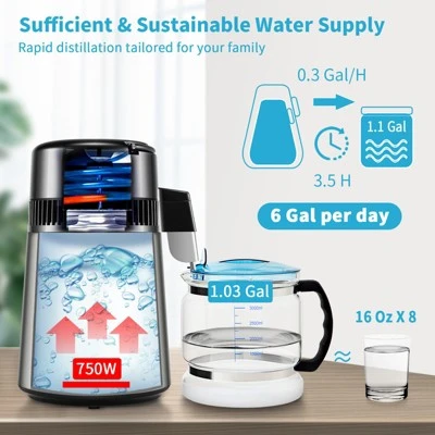 Efficient Water Purification: The 750-watt heating element allows our home water distiller to produce up to 0.26 Gal (1 L) per hour and about 6 Gal per day. It can effectively dissolve solids, VOCs and other impurities, offering you the pure distilled water for drinking at ease. Apart from distilling water, it can be used to make alcohol and essential oil as well. Perfect for offices, homes, labs, dental clinics, etc.