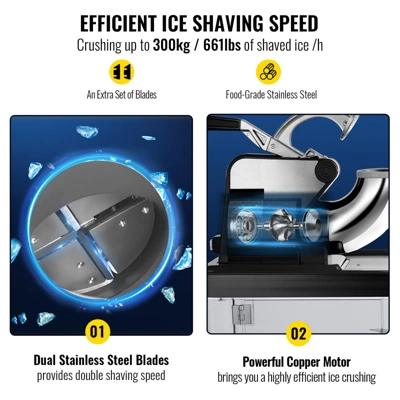 Higher Crushing Efficiency: Our commercial snow cone machine, ETL certified, features a higher ice shaving efficiency and hourly yield with the dual-blade design. It can double the efficiency of ice shaving compared to those with a single one. Fueled by the 300W copper motor (1450 r/min), our shaved ice maker can produce about 396.8 lbs (180 kg) per hour, meeting your urgent demands in a short time. Besides, another set of blades is provided for replacement.
