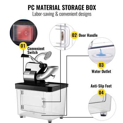 Integrated PC Storage Box: An extra-large PC storage box is integrated into our electric shaved ice machine, adopting the technique of one-piece injection moulding. It measures 18.5″ (47 cm) long, 14.2″ (36 cm) wide, 14.2″ (36 cm) deep, and 0.2″ (4 mm) thick, which is capable of holding around 9 Gal (34 L) of shaved snow ice. The thick case wall can keep the crushed ice inside frozen for longer, and the snow-ice won’t splash everywhere for secure operation concerns.