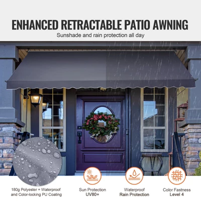 Sunshade and Waterproof: Are you still struggling with the summer heat? This large 178 x 47 in retractable patio awning features a 180g waterproof lock-color PU coating, providing UV protection rated at UV80+, making it the ideal awning for patio relaxation.