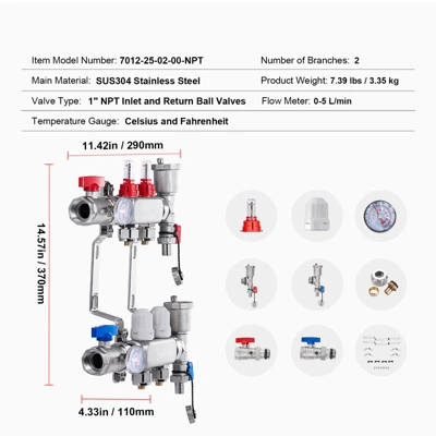 Product Parameters: This radiant heat manifold features 2 branches, 1-inch NPT supply and return ball valves, and supports a flow rate of up to 5L/min. It includes 1/2-inch adapters and 2 temperature gauges (display both Fahrenheit and Celsius), making it an ideal choice for efficient radiant floor heating systems.