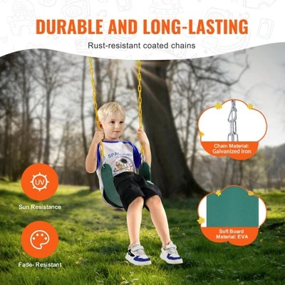 Durable and Reliable: The seats of the swing sets for backyard is made from durable EVA, designed to withstand outdoor conditions and provide hours of safe fun. The iron chain is coated with yellow plastic for a soft, pinch-free grip, paired with galvanized steel snap hooks and a stable triangular structure, ensuring ultimate comfort and safety during play.