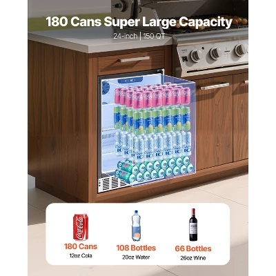 Large Storage Capacity: The 24″ outdoor beverage refrigerator measures 23.43 x 22.64 x 33.66 in, with the spacious space to hold up to 180 standard-sized cans. It features 3 adjustable shelves that help optimize storage space for better organization.