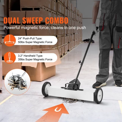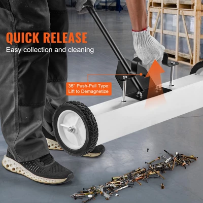 Superior Magnetic Power: The VEVOR magnetic sweeper with wheels includes a 24” magnetic sweeper with wheels and a 3.2” telescoping magnetic pickup tool, capable of holding up to 50 lbs (24”) and 35 lbs (3.2”) respectively. It effortlessly collects nails, screws, and black metal debris, protecting you from shards and sharp metals.