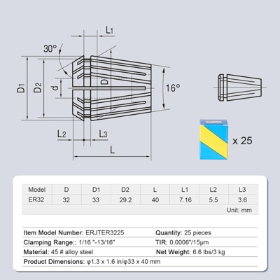 Standard Size: Our ER32 collet chucks are designed to clamp diameters ranging from 1/16″ to 13/16″. The precision is an impressive 0.0006 in/15 μm, ensuring top-notch accuracy for your machining needs.