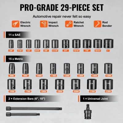 Abundant Components: This comprehensive set includes 11pcs SAE shallow sockets: 3/8″, 7/16″, 1/2″, 9/16″, 5/8″, 11/16″, 3/4″, 13/16″, 7/8″, 15/16″, 1″ and 15pcs metric shallow sockets: 8mm, 9mm, 10mm, 11mm, 12mm, 13mm, 14mm, 15mm, 16mm, 17mm, 18mm, 19mm, 20mm, 21mm, 22mm. It also includes 2 extension bars (6″, 10″) and a universal joint.