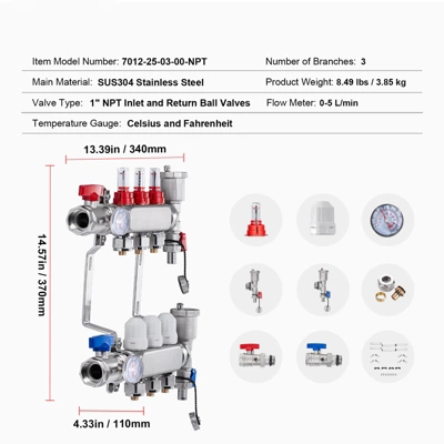 Product Parameters: This radiant heat manifold features 3 branches, 1-inch NPT supply and return ball valves, and supports a flow rate of up to 5L/min. It includes 1/2-inch adapters and 2 temperature gauges (display both Fahrenheit and Celsius), making it an ideal choice for efficient radiant floor heating systems.