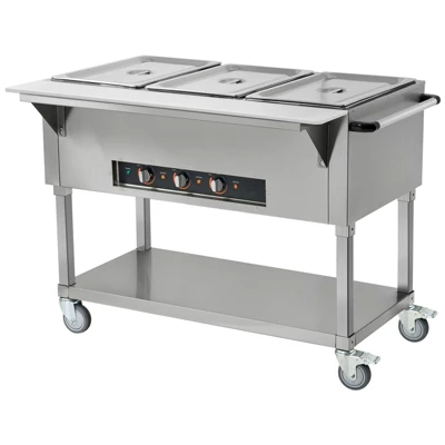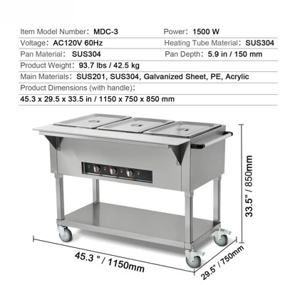 Multi-Purpose Food Warmer: Featuring a PE processing table, our 3-pot steam table provides additional workspace for convenient food preparation, cutting, and more. Furthermore, its durable bottom shelf offers ample storage for utensils, food pans, ingredients, and seasonings, keeping everything you need within reach.