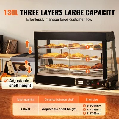 3-Tier Large Space: Dimensions: 35.71 x 18.50 x 25.20 inch / 907 x 470 x 640 mm. Our countertop food display case features 3 spacious food-grade shelves, allowing you to place different sizes of food freely. It is ideal for holding and storing pizza, egg tarts, fried chicken, or burgers, ensuring the food stays fresh for a long time.