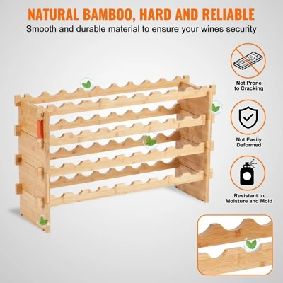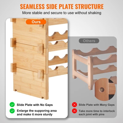 Natural Bamboo Wood: Our wine storage rack is made from high-quality bamboo, which is smooth, crack-resistant, and less likely to absorb moisture or mold. The natural bamboo has excellent resilience and supports wine bottles perfectly without wobbling.