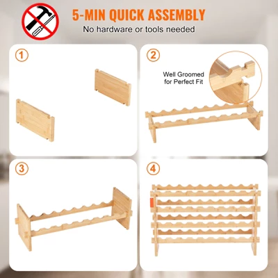 Hassle-Free Assembly: Assembling our freestanding wine rack is a breeze, taking just 5 minutes with no tools, nails, or screws required. It’s very simple, but please make sure to check that all parts are correctly aligned before assembly. You can also stack it to your preferred number of layers.