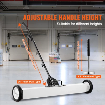 Superior Magnetic Power: The VEVOR magnetic sweeper with wheels includes a 36” magnetic sweeper with wheels and a 3.2” telescoping magnetic pickup tool, capable of holding up to 55 lbs (36”) and 35 lbs (3.2”) respectively. It effortlessly collects nails, screws, and black metal debris, protecting you from shards and sharp metals.