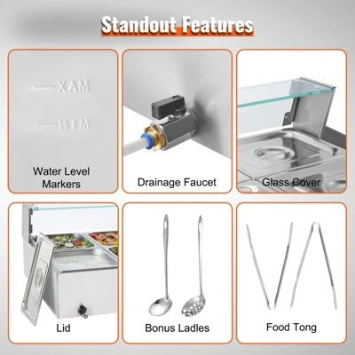 - Includes 8 food pans with lids, ladles, faucet for draining, and water level markers for easy maintenance.