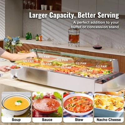 Includes 8 Pans: Our commercial food warmer comes with eight 8QT food pans (8*1/2-Size) accompanied by their respective lids, allowing you to serve different dishes simultaneously. Feel free to change up your menu from soups and sauces to stew, or even nacho cheese and chocolate.