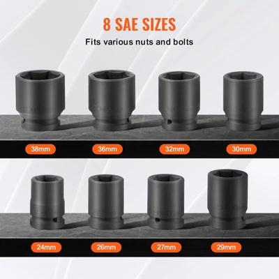 3/4 Inch Drive Axle Nut Socket Set: This metric 8-piece axle nut impact socket set includes sizes 24mm, 26mm, 27mm, 29mm, 30mm, 32mm, 36mm, and 38mm. It is perfect for efficiently tightening axle nuts and bolts.