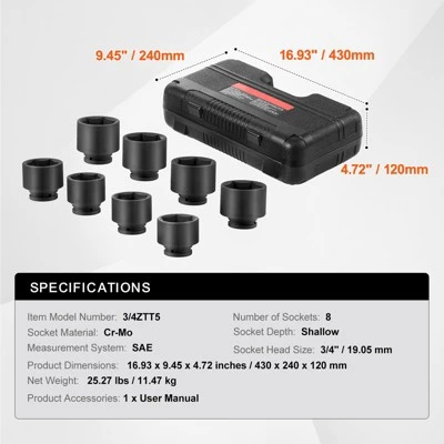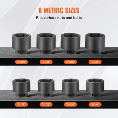 3/4 Inch Drive Axle Nut Socket Set: This SAE 8-piece axle nut impact socket set includes sizes 2-1/16″, 2-1/8″, 2-3/16″, 2-1/4″, 2-5/16″, 2-3/8″, 2-7/16″, and 2-1/2″. It is perfect for efficiently tightening axle nuts and bolts.