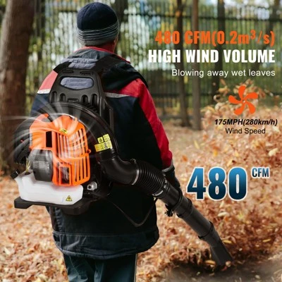 High-performance Engine: The backpack leaf blower features a robust 2-stroke 52CC engine with 6500 RPM, enhancing fuel efficiency by 20%. Delivers 480CFM airflow volume and 175MPH speed, ideal for clearing wet leaves, sand, gravel, and snow.