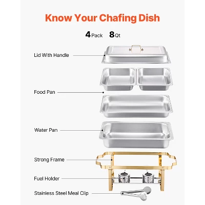 Ample Capacity: With 4x4Qt half-size pans and 2x8Qt full-size pans, this catering chafer set can hold multiple servings of your favorite dishes. The included multifunctional meal clip makes it easy to serve pasta, steak, soup, chicken, and more
