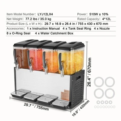 Large Capacity: This commercial beverage dispenser has a tank capacity of 12 L, accommodating a large volume of beverages. It features an upgraded wide diameter dispensing spout, allowing smooth and easy dispensing of drinks with small particles such as coconut juice and fruit pulp. Equipped with a rubber sealing ring to prevent beverage leakage.