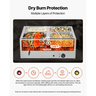 Smart Stop Feature: When the temperature passes 248°F (120°C), the food warmer stops heating on its own. To use again, refill with water and press the reset button. Avoid pouring in ice water, which can damage the heating tube