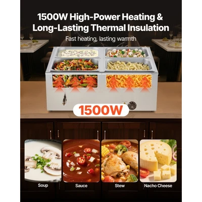 Large Space Combo: With a standard 5.9 in depth, this buffet bain marie comes with 4 x 1/2 size pans that fit all 5.9 in deep compartments. You can combine or swap them easily, creating menus from soups and sauces to stews, nacho cheese, or chocolate