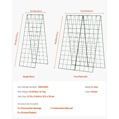 What’s Included: The package includes 4 metal mesh panels (16.54″ W x 46.06″ H), 4 metal grids, 4 connecting springs, 8 fixing stakes, and 1 instruction manual.