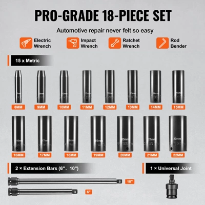 Abundant Components: This comprehensive set includes 15pcs metric deep impact sockets: 8mm, 9mm, 10mm, 11mm, 12mm, 13mm, 14mm, 15mm, 16mm, 17mm, 18mm, 19mm, 20mm, 21mm, 22mm. It also includes 2 extension bars (6″, 10″) and a universal joint.