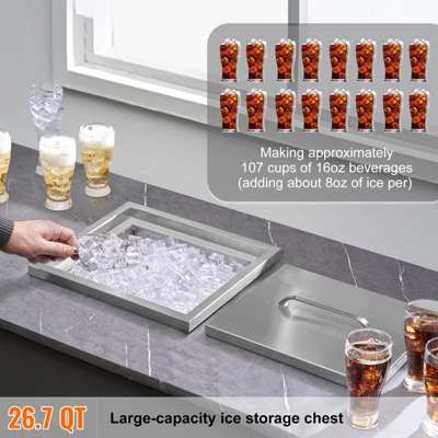 Large Capacity: A large-capacity drop in ice bin that can hold about 26.7QT (25.3L) of ice. When filled, it can make approximately 107 cups of 16oz beverages. Ideal for storing a large amount of ice or chilling various drinks.