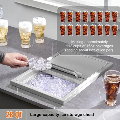 Large Capacity: A large-capacity drop in ice bin that can hold about 28QT (26.7L) of ice. When filled, it can make approximately 112 cups of 16oz beverages. Ideal for storing a large amount of ice or chilling various drinks.