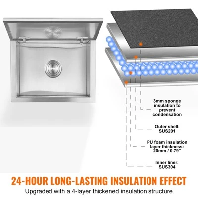 Food-Grade Material: The entire ice chest is made from stainless steel (top lid + interior SUS304, exterior SUS201), making it durable and rust-resistant. The interior uses an integrated full-welding process, greatly reducing the possibility of leaks.