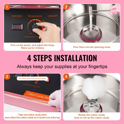 Easy-Operating Process: Using this machine couldn’t be easier. Turn on the power, adjust the temperature, warm up for 2-3 minutes, and pour sugar into the spinning head, and then you just need to use the sticks to collect the cotton candies from the head.