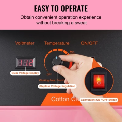 Temp Control: Unlike the common ones, our electric candy floss maker features a voltage meter and a temp control knob. By changing voltage, you can simply adjust the temperature from 244.9°F/118.3℃ to 439.2°F/226.2℃. If you want to try different flavored sugars, you will absolutely need this.