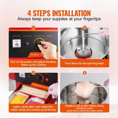 Easy-Operating Process: Using this machine couldn’t be easier. Turn on the power, adjust the temperature, warm up for 2-3 minutes, and pour sugar into the spinning head, and then you just need to use the sticks to collect the cotton candies from the head.
