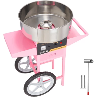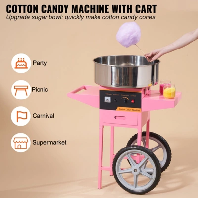 Work with Any Candy You Like: This cotton machine allows you to use the traditional flossing sugars, milk sugars, fruit cubes, or any of your favorite hard candies to make delicious cotton candies. Large wheels and sturdy handle facilitate movement, and it is perfect for carnivals, festivals, birthday parties, and sports events.