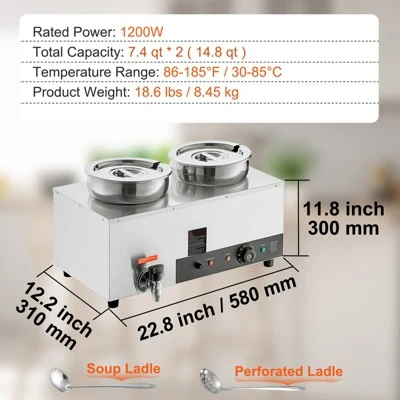 Includes two 7.4Qt Soup Pots: Our commercial soup warmer comes equipped with two 7.4Qt round pots with their respective lids, allowing you to serve different dishes simultaneously. Feel free to change up your menu from soups and sauces to stew, or even nacho cheese and chocolate.