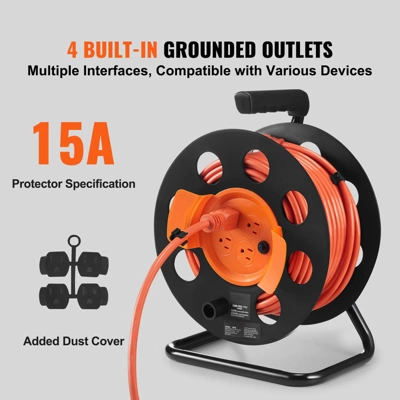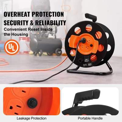 Portable & Easy to Store: The extendable extension cord reel is easy to install and use. It extends and retracts manually, smoothly rewinds, and locks easily. The metal stand helps keep the cord reel upright, and the handle makes it convenient to carry. It can be taken to job sites or used in the garage, occupying minimal space.