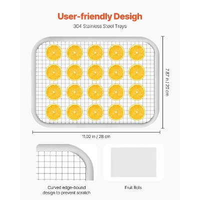 Edge-bound Trays: The beef jerky dehydrator machine comes with six 304 stainless steel trays (11.02 x 7.87 in / 28 x 20 cm) for direct contact with food with peace of mind. The upgraded curved edge-bound design is smooth, preventing injury to hands, easy to clean, and can support heavy loads