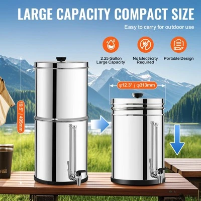 Portable Large Capacity: The 2.25-gallon capacity meets the drinking needs of 1-4 people. The stainless steel countertop water filter uses compact design reduces the volume by half when stored, making it highly portable.