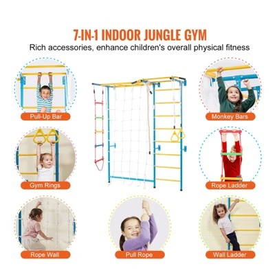 Multifunctional Climbing Playset: Our wall gym for kids combines a pull-up bar, gym rings, rope ladder, and other play activities to help children exercise, improve coordination, and have fun.