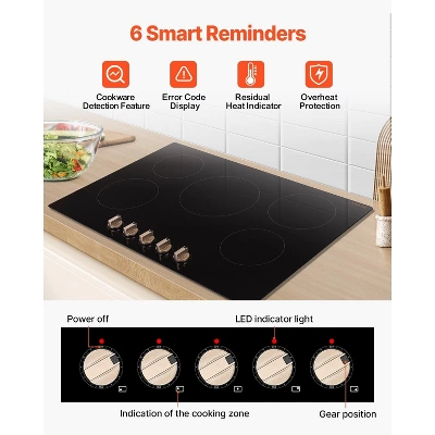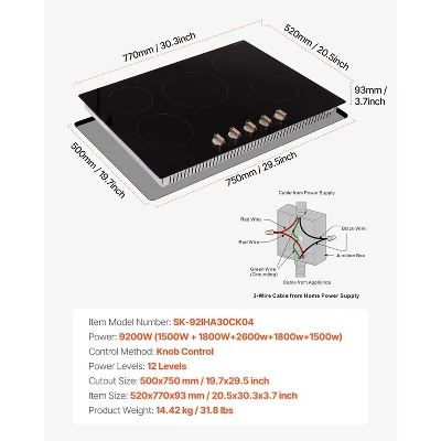 High-Powered Induction Cooktop: The 9200W built-in electric stove offers fast and even heating, with 12 adjustable power levels, making it ideal for stewing, frying, simmering, steaming, boiling, sautéing, and roasting. With 5 cooking zones, you can cook efficiently and use a wide range of compatible cookware.