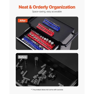 Professional Design: Our socket organizer holders feature 2 colors: blue for metric and red for SAE. The set includes 108 slots, suitable for SAE sizes from 1/8″ to 5/8″ (1/4″ drive) and 1/4″ to 1″ (3/8″ drive) ; metric sizes from 4 to 14mm (1/4″ drive) and 6 to 20mm (3/8″ drive).