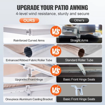 Built to Last: This manual retractable awning features robust steel tube supports with enhanced durability and wear resistance. The connections are secured with screws for added stability and wind resistance (up to 4th level). The thickened aluminum top tube ensures the awning remains taut and prevents fabric sagging. We recommend retracting it during storms to prolong its lifespan.