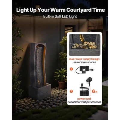 Durable Materials: Made with weather-resistant resin and triple-layer fiberglass, this water fountain withstands wind, sunlight, and extreme temperatures. It remains colorfast and crack-free, making it suitable for gardens, yards, and patios Lighting: The yard water fountain features built-in soft lights, creating a calming lighting effect at night. With a 6 ft power cord and dual power supplies for the pump and light, it’s easy to maintain and adaptable to various settings