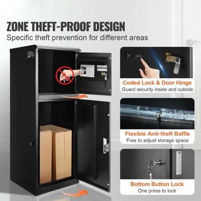 Multiple Anti-Theft Protections: Don’t worry about losing keys and being unable to retrieve your parcels. VEVOR 16.2″ x 15.8″ x 44″ mailbox is equipped with a secure password lock and internal hinge to ensure your packages are well-protected. A large anti-theft baffle has also been added to the drop slot, preventing parcels from being fished out.