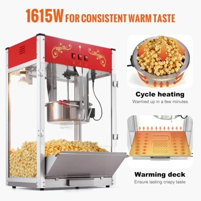 High Output with Powerful Performance: This commercial popcorn machine features a power of 1615W and a 16 oz capacity, perfect for busy convenience stores. The kettle preheats in just a few minutes, ready to satisfy sports fans, festival goers, and party guests with plenty to eat.