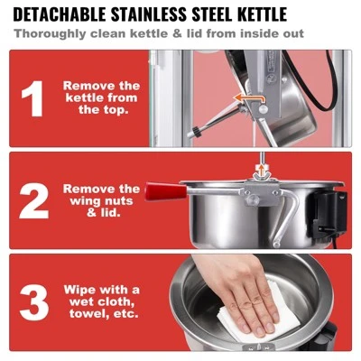 Durable Structure, Easy to Clean: This movie theater style popcorn machine is made of a cold-rolled plate frame and tempered glass panels, designed for frequent use. The door with a magnetic latch allows for quick access and enhances the presentation of the popcorn inside. The printed graphics on top may also attract some hungry eyes. Additionally, the wing nut on the kettle allows for easy removal of the lid for thorough cleaning. Easy cleaning will extend the machine’s lifespan.