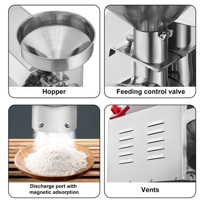 Considerable & Exquisite Details: A food-grade stainless steel hopper with a large hold capacity increases work efficiency. It is easy to clean and load. And there is a blanking valve for feeding volume and speed control. What’s more, to ensure the hygiene of powder, the outlet is designed with a strong magnetic device that can adsorb the iron chipping produced. The overload protection will spring up automatically when the grinder is overloaded, thus protecting the motor from damage.
