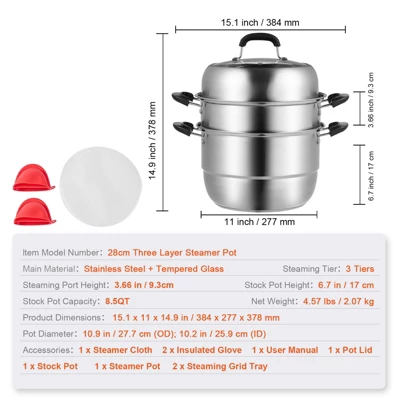 Large Capacity & Multi-functional: Our 11 inch / 28 cm steamer pot set for cooking comes with a stock pot, a streamer and 2 steaming trays for simultaneous boiling and streaming, and you can use them together or individually as needed. 8.5QT large bottom stock pot can accommodate various ingredients at one time, effortlessly preparing a table full of delicious dishes. Also comes with a steamer cloth for non-sticking cooking.