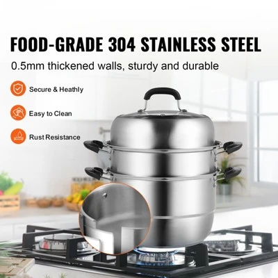 Food-Grade 304 Stainless Steel: VEVOR food-grade 304 stainless steel steamer – built to last with its durable and sturdy construction, while the well-polished mirror surface enhances thermal conductivity for efficient heating. 0.5mm thickened pot wall prevents deformation, and the anti-oxidation protective layer also keeps the food steamer rust-free and easy to clean.