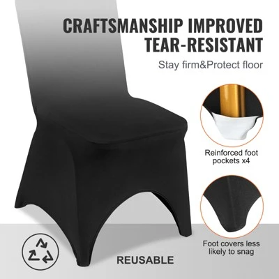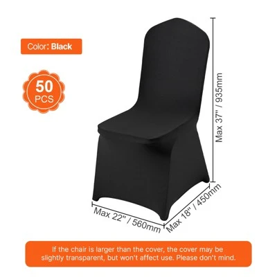 Premium Material: Color: Black; Quantity per box: 50 PCS; Material: 95% Polyester Fiber & 5% Spandex. Durable fabric and quality stitching offer additional comfort and elasticity. Universal spandex folding chair covers are designed to protect your chairs from accidental spills, pet scratches, everyday stains, and tears, making them ideal for both indoor and outdoor events.